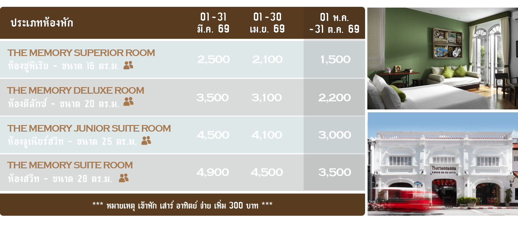 - บุคคลที่ 3 อายุ 8 ปีขึ้นไป เตียงเสริม ชำระเพิ่ม 600 บ าท/คืน
